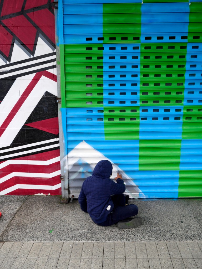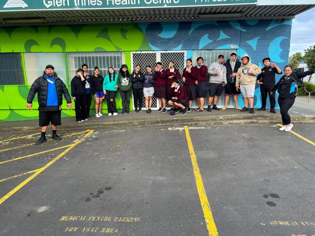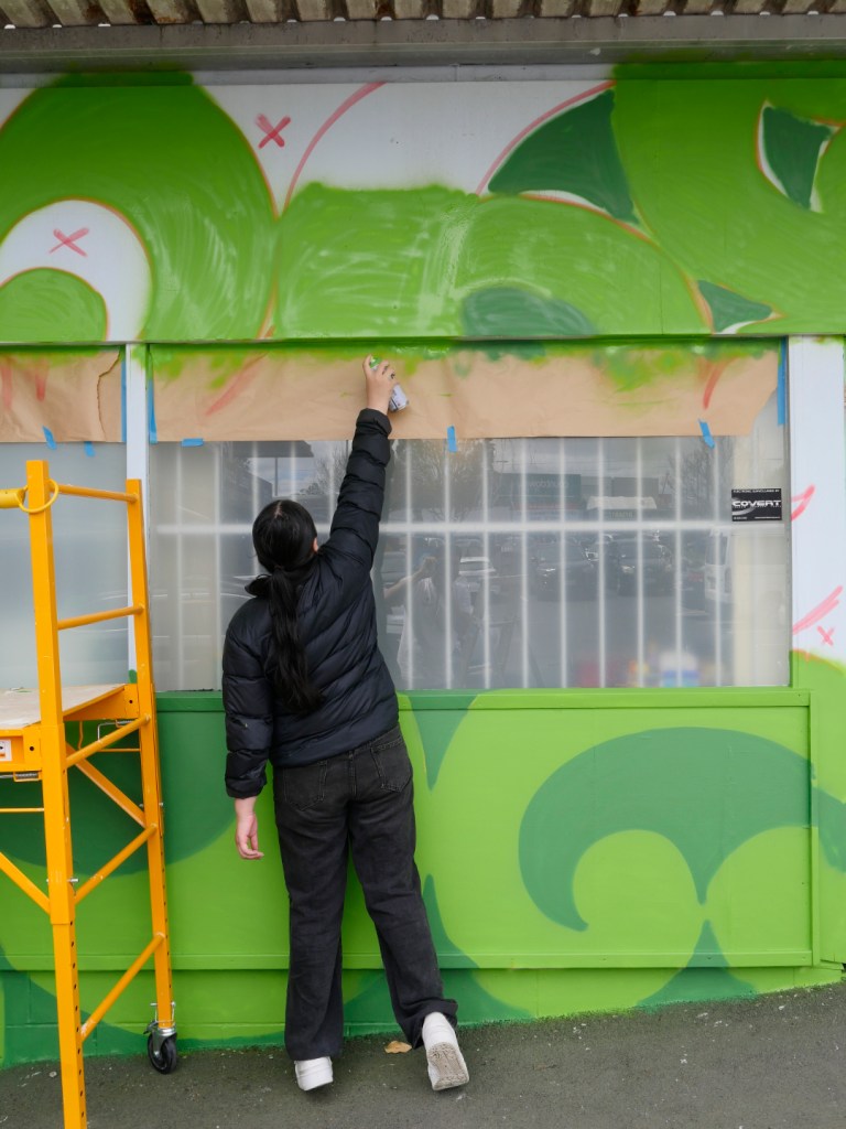 We teamed up with the Glen Innes Family Centre’s (GIFC) Mana Rangatahi youth programme to create a design to paint on the front and back of their new office building. We provided advice on how their design might suit the challenging surfaces where it will be painted, guided them on how to prep, assisted with outlining their design onto the walls, and finally colouring it in. For all participants, it was their first time using spray paint, but judging by the final result, you would never tell.