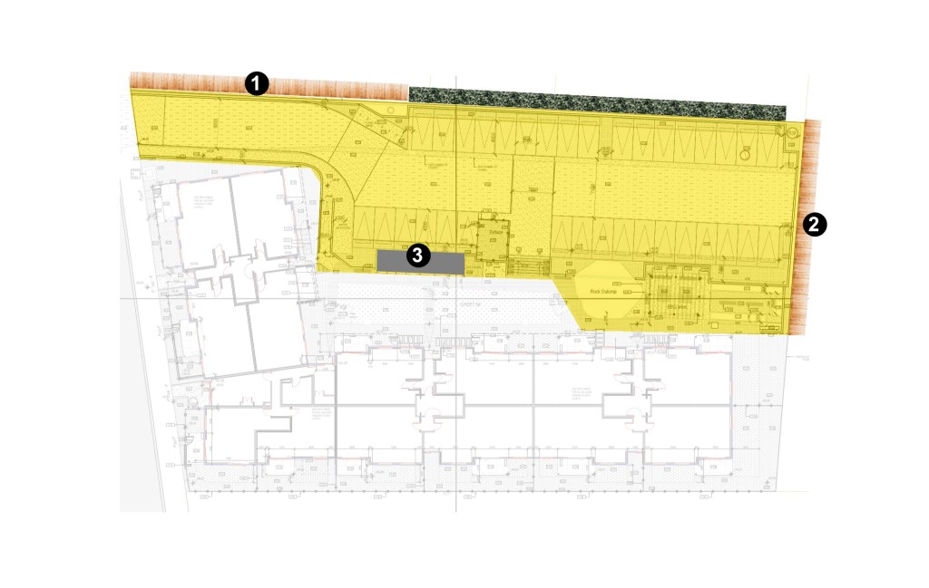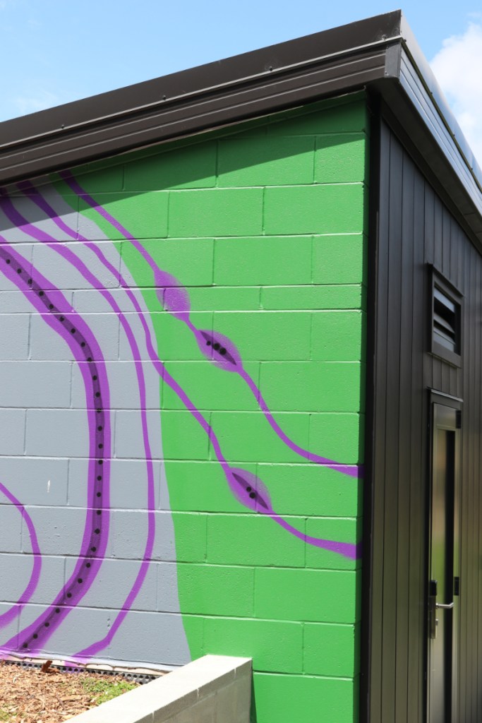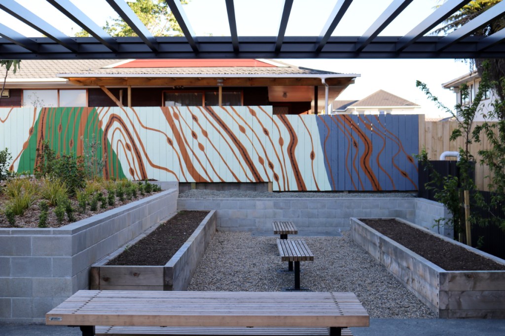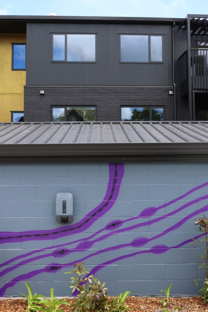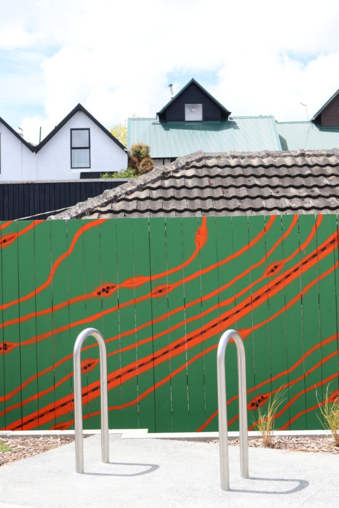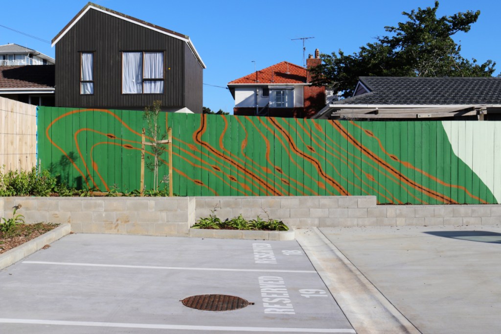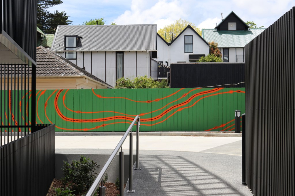 We were tasked with creating a custom mural on a timber fence and brick block for a new housing development. The design features the topological lines of the local maunga, linking the site to an important landmark. It reimagines the path of lava that flowed from the mountain during an eruption about 120,000 years ago, symbolizing movement and how people currently move throughout the city. A key theme of the mural is reinforcing that Kaweka is home, emphasizing that while residents may move around the city and beyond, when they see the distinct mural on return they know they’re home.